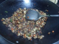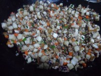 关火 把板栗饭倒入刚炒好的材料中 拌匀