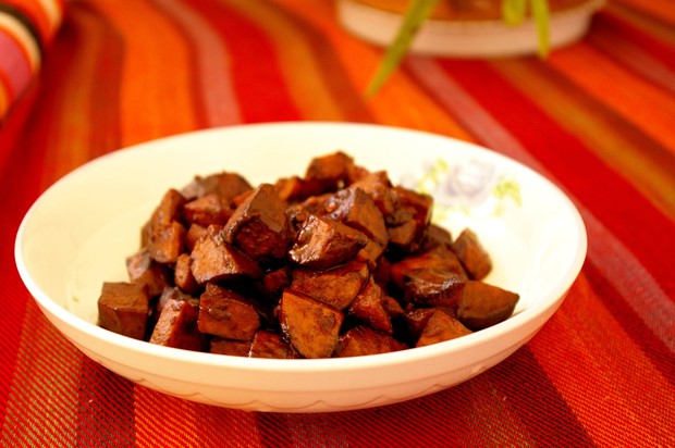 芋头切块,锅入油烧热,入豆瓣略炒至油红,入芋头、老抽翻炒至均匀上色