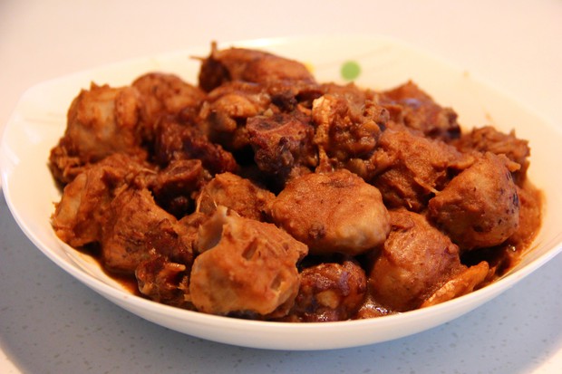 蒜、姜炒香后,加入肉块翻炒。