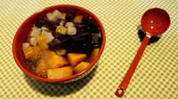 吃时加红豆汤,西米,红薯块,仙草冻等