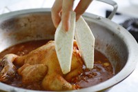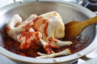 起锅爆姜蒜,下整鸡均匀干煎表面,然后干锅下米酒,片糖拌炒,倒入水(水需要浸过鸡身),再倒入剩余的调制好的酱汁。