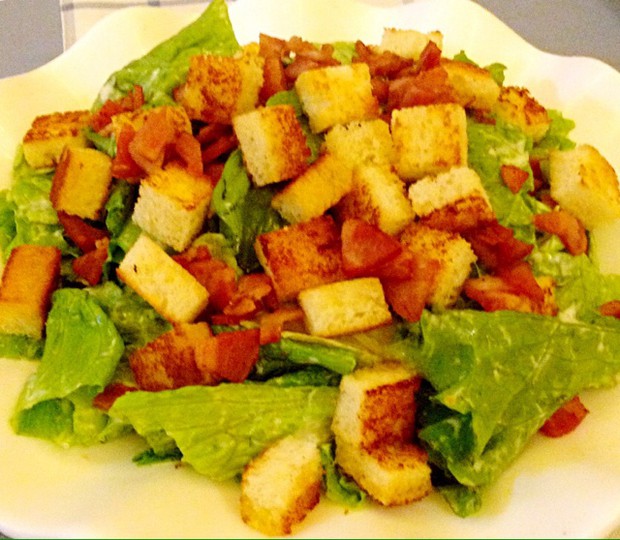 4. 将生菜放入沙拉盆中,加入调好的酱汁,撒上培根碎和面包丁即可。