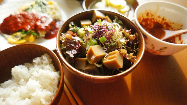 菜蔬置於底部,放上橡子涼粉,淋上醬料