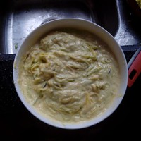 2. 面粉加水用筷子搅拌~蓝后放入南瓜丝或萝卜丝、韭菜、鸡蛋和盐~不能太稀呦,要不然摊饼的时候不容易翻T^T