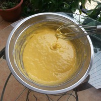 牛奶、植物油和南瓜泥依次加入到蛋黄中,搅拌均匀