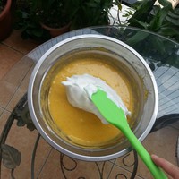 打好的蛋白霜分三次加入到蛋黄糊中,翻拌均匀。