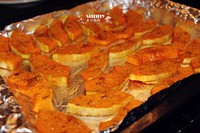 南瓜片表面再均匀的撒盐和黑胡椒粉