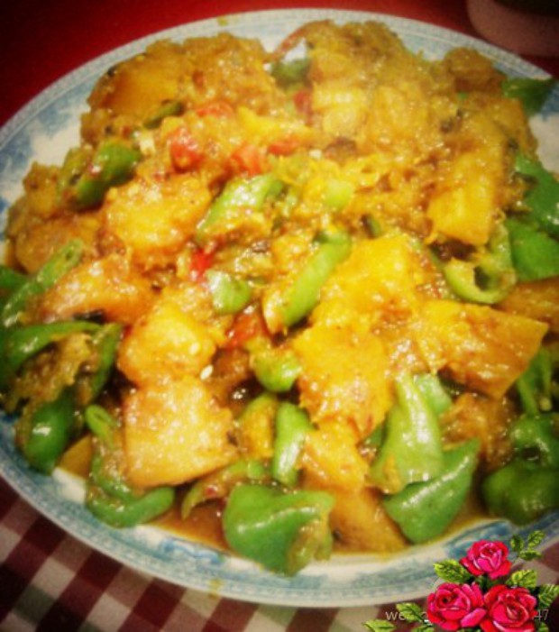 3. 至南瓜软熟,下青辣椒翻炒