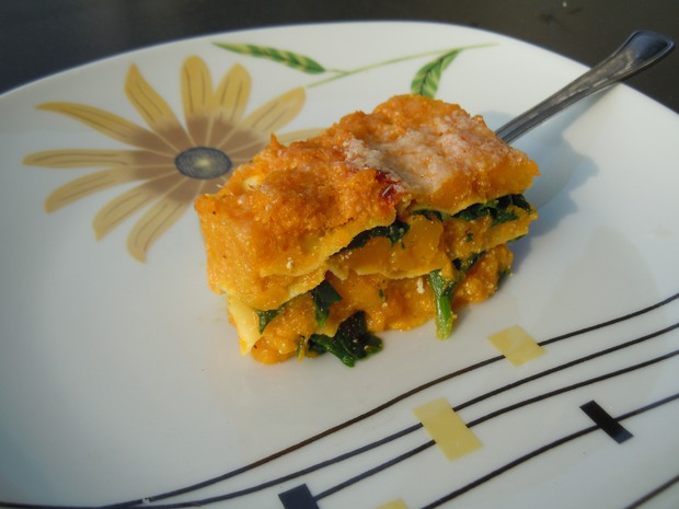 在容器里先铺上一层南瓜酱 放点菠菜 铺上一层千层面皮