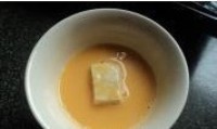 3. 锅中少许油(小火),下吸过蛋液的冻豆腐煎 再放上姜丝 调成中火