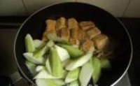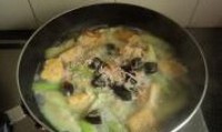 4. 丝瓜控水后,放入锅中晃锅 待丝瓜稍微软后加水,再加皮蛋 干海鲜