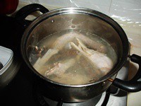 重新在汤锅中一次性注满清水,放入江鸭,大火煮,煮五分钟。