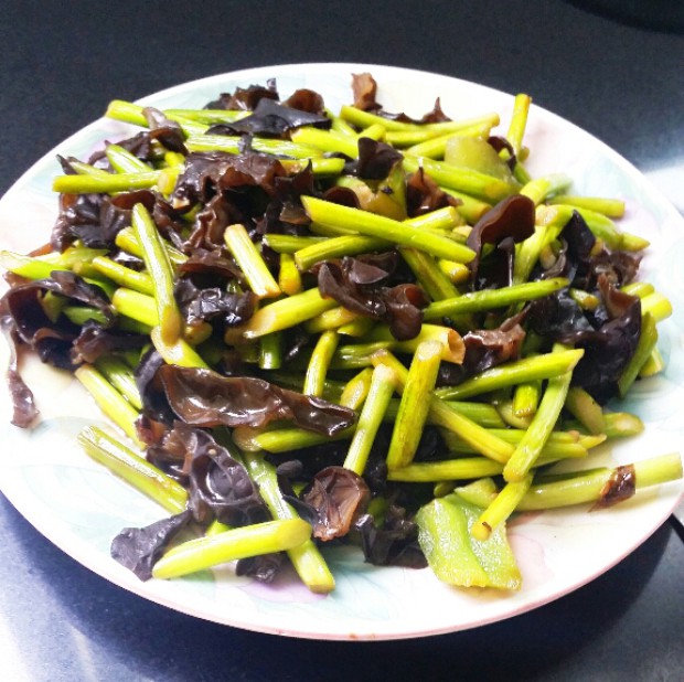 蒜台切段,木耳泡发切丝备用,准备勾芡