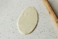 拿一个面团,收口朝上按扁擀开,放上一份肉馅。