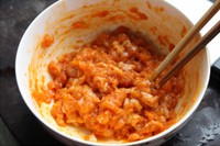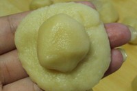 从冰箱取出鸡肉馅,取饼皮一份按扁,虎口收紧,将馅料万全包入,收口向下放置