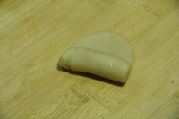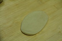 取外皮按如下步骤操作——按扁,用擀面杖擀成椭圆形