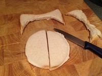 用杯口在吐司上压出一个圆形印儿,用刀沿印儿切开并将圆形吐司片从中一分为二。