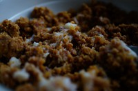 熟面粉中加入猪油、白砂糖和冷藏好的蜂蜜火腿,拌匀,加入玫瑰花酱。