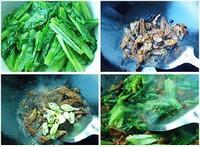 将罐头中的鱼和豆豉倒在一个碗中,鱼切成块。炒锅内放少许油,热后放入油菜菜的根茎,略炒后再倒入叶部,不断翻炒