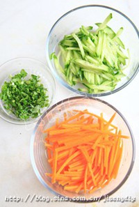 将小黄瓜洗净,切丝;胡萝卜去皮洗净,切丝,香菜洗净,切末备用