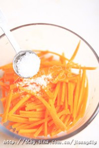 将盐加入胡萝卜丝中,拌匀腌制片刻,冲净沥干水分