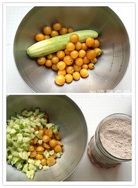 姑娘对半切开、黄瓜切丁,一层料洒一层梅粉即可