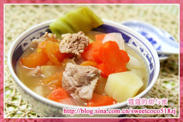 我做的时候把熏火腿片改成了孕妇适合多吃的牛肉,这样更加强了营养。其实和沪式的罗宋汤有点象,只是不加番茄酱,因此更适合胃口不好的孕妈妈。我特意做的量多一些,第二天热了配着面包当早餐非常好。