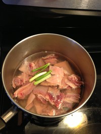 将切好的牛腩、生姜、少许葱段一起下入清水锅中,开盖煮开后继续煮2-3分钟,然后捞起牛腩,温水冲去表面浮沫,将牛腩沥干。