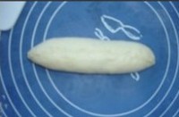 松弛好的面团取一份压扁,擀成椭圆形,翻面,铺上内馅