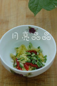 姜蒜剁细末,葱切葱花,泡椒切碎,全部放在一个小碗中