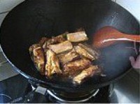 6. 锅内烧热油,放入排骨翻炒,加少许老抽,糖翻炒至排骨均匀上色