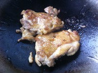 锅内倒入少许油,5成热后放入腌制好的鸡腿,鸡皮先朝下,煎制过程中不断用铲子压鸡肉,煎出鸡油,煎至两面金黄盛出待用。