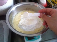 直接称入180克粉,和7克泡打粉4克苏打粉(不需过筛。电子秤称几克的东西称不准的,泡打粉小苏打都算4克一小勺5ML一平勺。