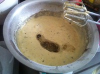 此时, 搅拌好的面糊应该有一定稠度,提起打蛋头,低落的面糊不会马上消失。如果面糊稀稀拉拉的,也是正常的,枣泥的程度和鸡蛋的大小都会影响面糊的含水量,十几克十几克的加入低筋粉直到浓稠就好了。