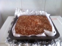 倒入铺好油纸的八寸深烤盘中,撒上白芝麻,入预热好165度烤箱中烘烤,蛋糕很厚所以要低温慢烤约五十分钟。