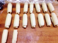 将圆筒状油皮收口朝上,按压中间并把两端折向中间(如有必要可再重复一遍擀开和静置的过程),油皮擀开,将馅料包入油皮,封口捏紧朝下。