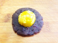此时制作豆沙馅,将豆沙馅按扁包入半个咸蛋黄。