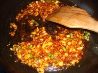 放入煎炸好的螃蟹块,翻炒烹入白酒