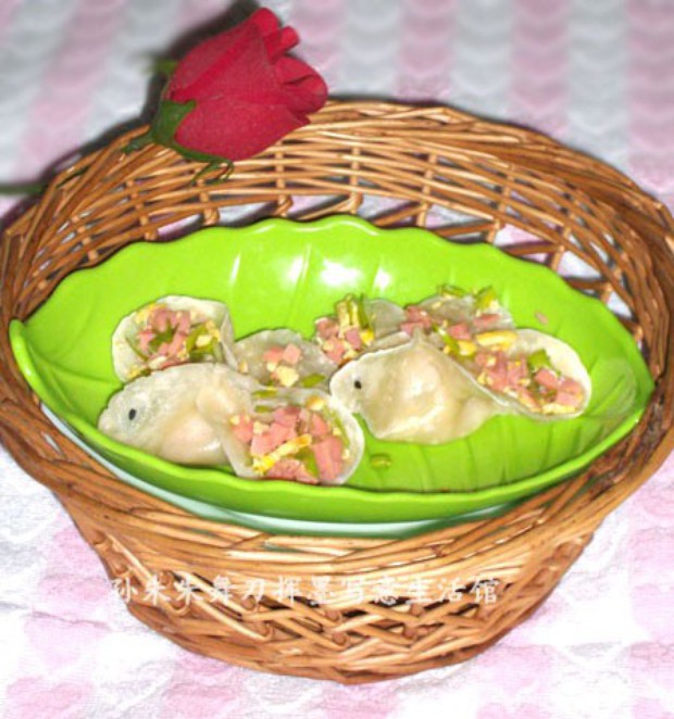 上面的捏成尾巴和头部,放上黑芝麻做眼睛.大火蒸十分钟.将翅膀上撒上火腿末鸡蛋末香葱末做装饰