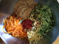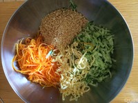 黄瓜洗干净擦丝;胡萝卜刨皮切丝;意大利面煮熟。
