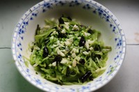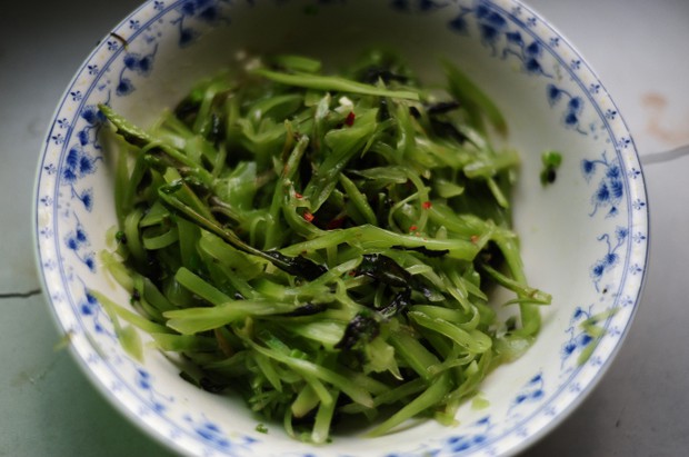 把滚油均匀的淋在莴笋丝上,最好是蒜末和葱花上都淋到,淋油的过程没拍到好遗憾
