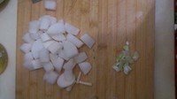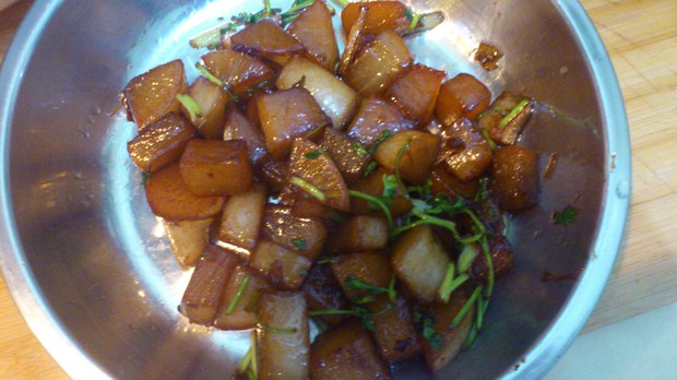 少油烧热后,下葱末儿,微香时下白萝卜块儿,翻炒一下,让白萝卜四面都见油一次