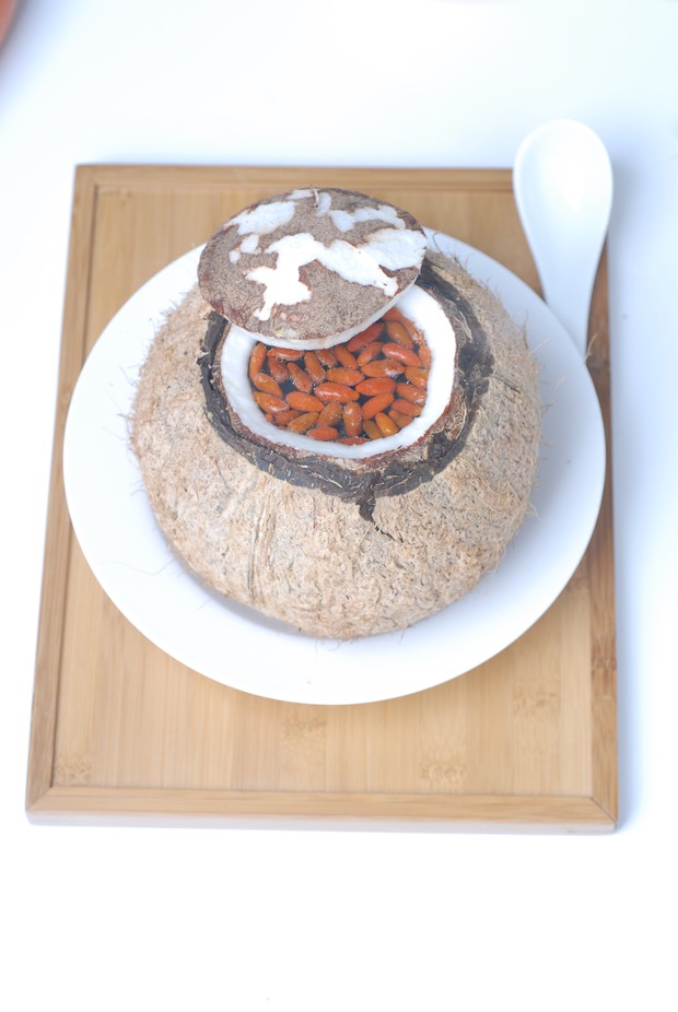 所有食材放入椰子里,倒入椰汁,盖上椰盖蒸制2小时。