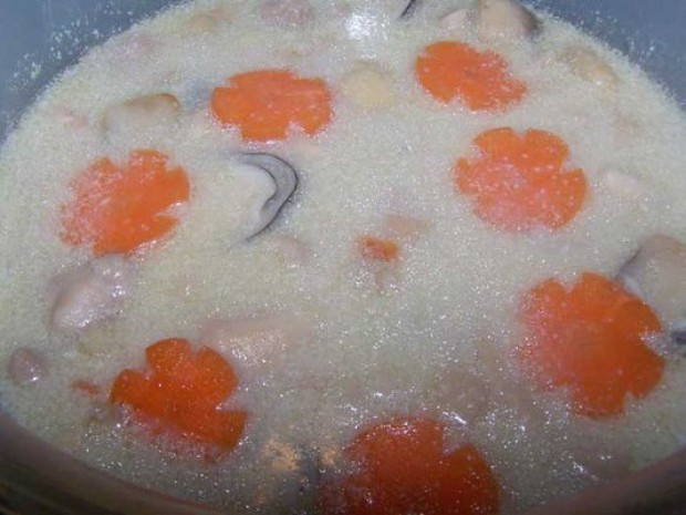 煮到鸡肉熟透后,加入胡萝卜花片、盐、胡椒粉、鸡精调味,出锅装碗。