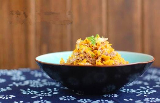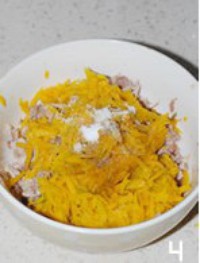 南瓜去皮去囊,用擦丝器擦成丝,入开水锅焯一下。(南瓜比较硬,用擦丝器更省时省力,南瓜入锅时间不能长,否则就软烂成碎末了)