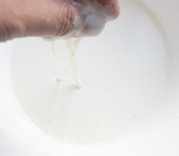 淀粉倒入大碗中,一点点加入适量水,干稀度为抓起时顺手淌汁为宜。再加少许盐、几滴油,抓拌均匀。