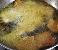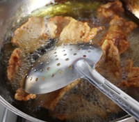 炸至颜色金黄即捞出,直至将全部肉片都炸好。