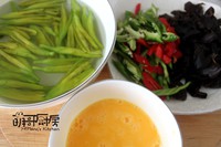 鸡蛋打散,青红椒切丝,黄花菜用开水过一下,但不要超过30秒。