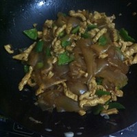 待锅里的葱姜蒜传出香味,倒入鸡肉,快速翻炒至变色,再放入青椒,翻炒一分钟,最后放入粉皮,翻炒5秒!