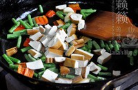 将五香干子下入锅中翻炒均匀,喷入料酒,酱油,下精盐炒匀